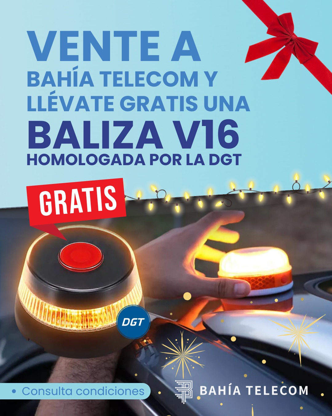 Contrata nuestro pack fibra+móvil de 800Mb y 1 línea de 100Gb 5G de 19,90€/mes y llévate gratis esta baliza V16 homologada.