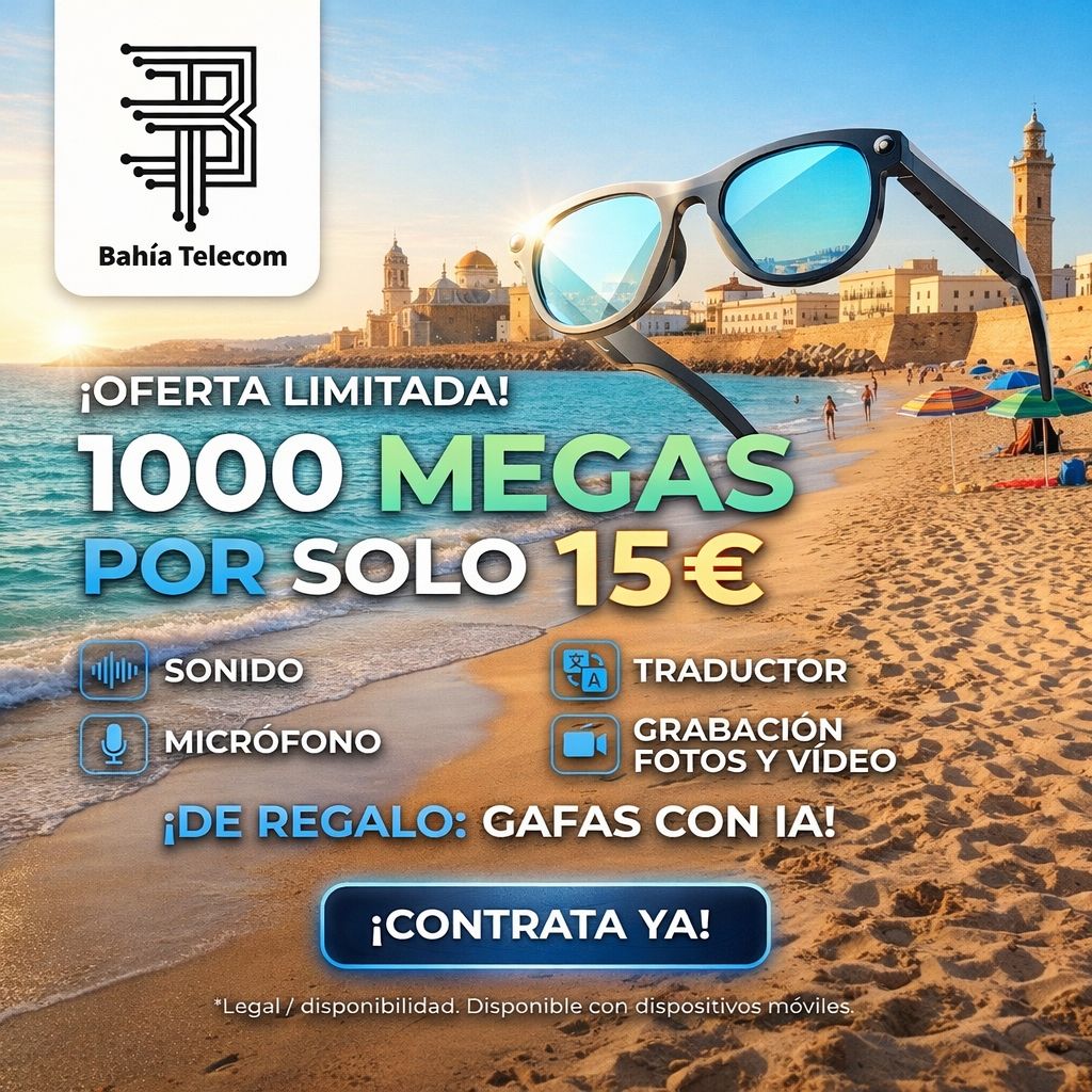 Contrata nuestra tarifa de 1000mb solo fibra por 15€ y llévate gratis estas gafas con IA , altavoces, micrófono incorporados, traduce conversaciones y captura cada momento con fotos y vídeos directamente desde tus gafas*